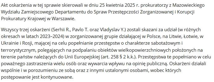 Sąd Okręgowy Warszawa-Praga w Warszawie w dniu 18 września 2025 r. wydał wyrok skazujący trzech obywateli Ukrainy (Serhiiego R., Pavla T. oraz Vladyslava Y.) za udział w zorganizowanej grupie przestępczej o charakterze sabotażowo-terrorystycznym.