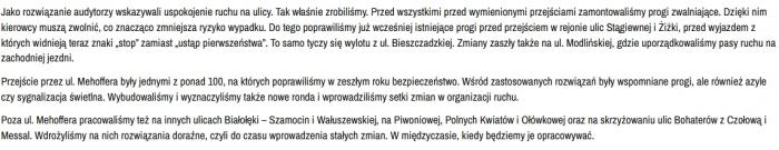 Wystawione przez audytorów oceny nie budziły wątpliwości, że wszystkie te zebry wymagały zmian. Zwracali oni uwagę na prędkość poruszających się Mehoffera pojazdów. Według pomiarów, które przeprowadziliśmy na różnych odcinkach ulicy w latach 2019, 2020, 2021 kierowcy potrafili rozpędzać się do 90, a nawet ponad 100 km/h przy dopuszczalnej prędkości 50 km/h. Poza prędkością problemem była także ograniczona widoczność w rejonie przejść.