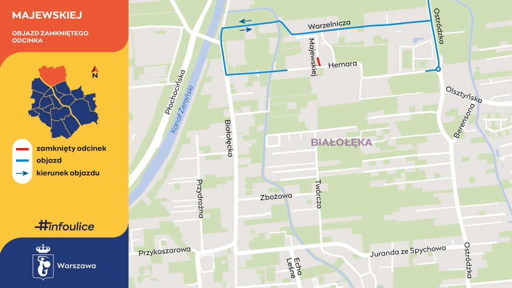 To już jutro - w czwartek, 30 kwietnia 2026 roku, około godziny 7:00 drogowcy zamkną połączenie ulicy Majewskiej z Hemara. Kierowcy pojadą do Warzelniczej i dalej Białołęcką lub Ostródzką. Z kolei na Hemara przejadą tymczasową jezdnią, którą ominą plac budowy.