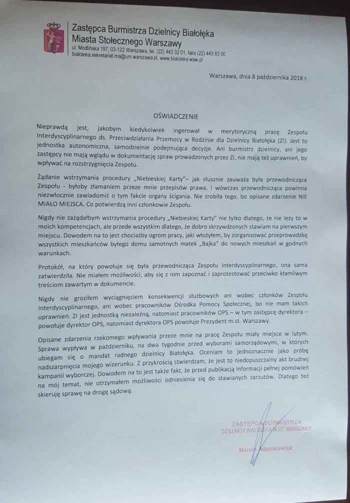 Po wczorajszym opublikowaniu pisma, które wpłynęło do Komisji Polityki Społecznej i Ochrony Zdrowia, wiceburmistrz Marcin Adamkiewicz wydał oświadczenie w którym zaprzecza zawartym w nim informacjom i zapowiada skierowanie sprawy do sądu.